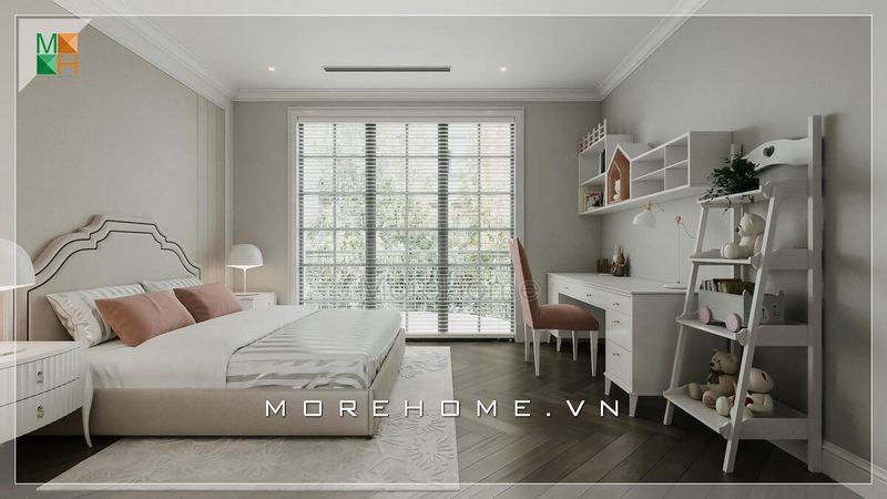 Thiết kế phòng ngủ biệt thự dành riêng cho phái nữ đẹp sang trọng với phong cách hiện đại sử dụng tone trắng chủ đạo trẻ trung, cao cấp.