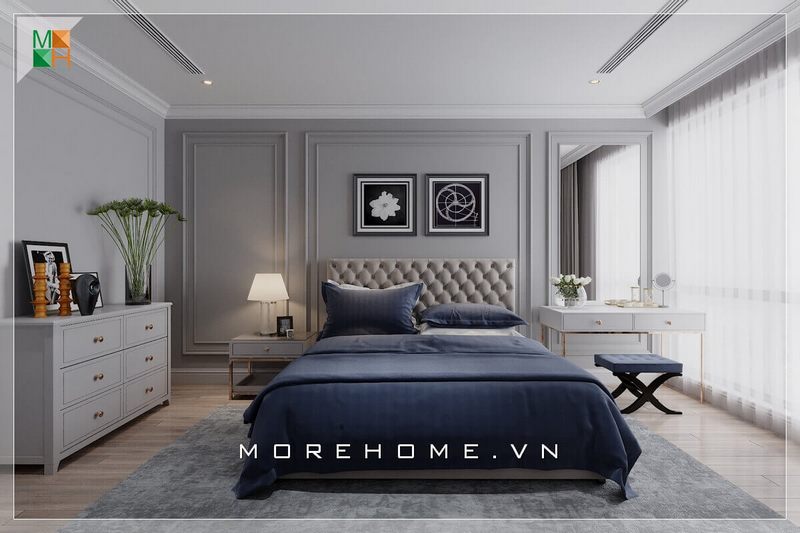 Thiết kế phòng ngủ chung cư mang phòng cách tân cổ điển, màu sắc hài hòa giữa trắng và xám khiến căn phòng trở nên sang trọng và tôn vẻ sang trọng hơn.