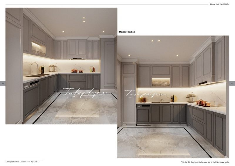 Có thể lựa chọn mẫu thiết kế phòng bếp có hệ thống tủ kiểu chữ L tân cổ điển màu trắng xám nhẹ nhàng cho không gian cao cấp, sang trọng hơn