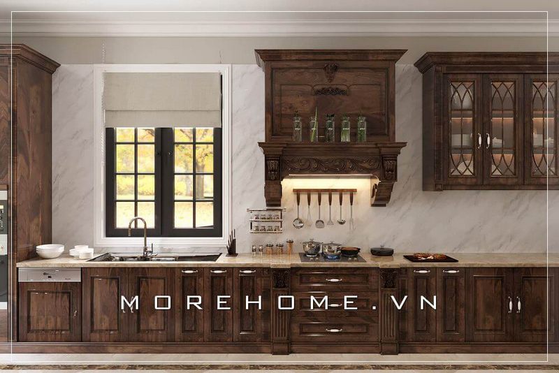 Thiết kế tủ bếp chữ L gỗ tự nhiên cao cấp phong cách tân cổ điển sang trọng và tiện nghi