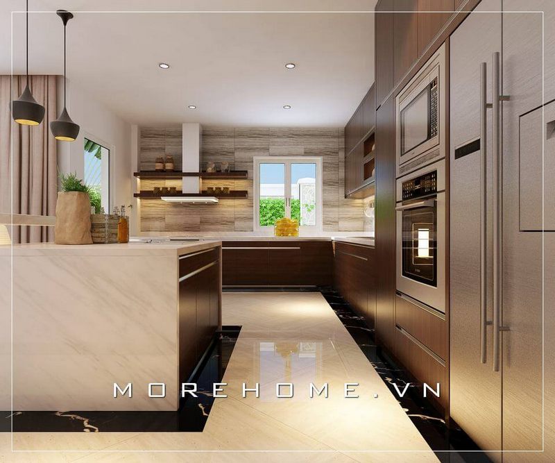 Phía bên trái mẫu thiết kế phòng bếp là phần hệ tủ được thiết kế để đồ khô cùng với hệ thống tủ lạnh, lò vi sóng, lò nướng