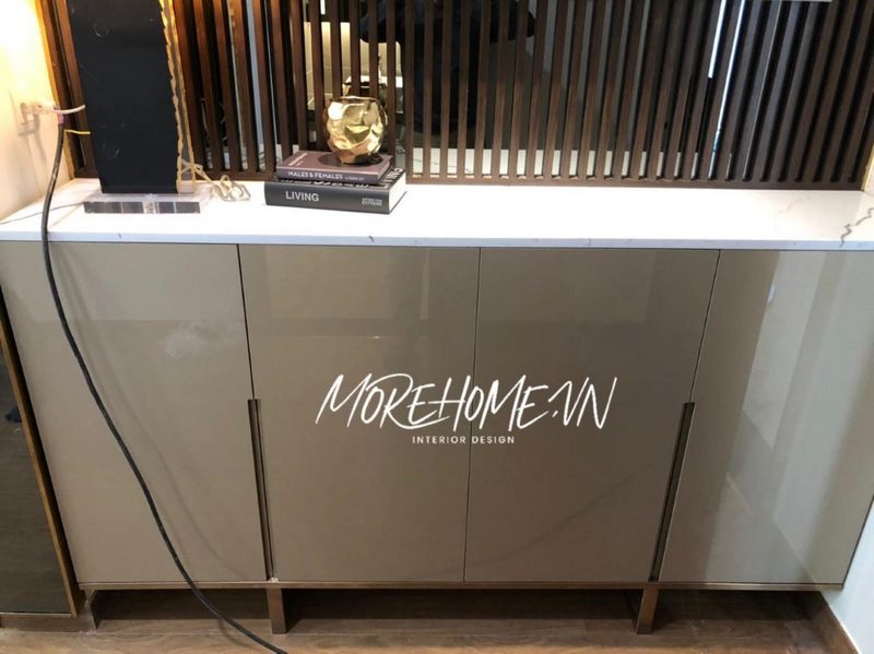 Mẫu kệ tủ gỗ công nghiệp Acrylic bóng gương trắng kết hợp với chân kệ inox cao cấp mang lại phong cách hiện đại.